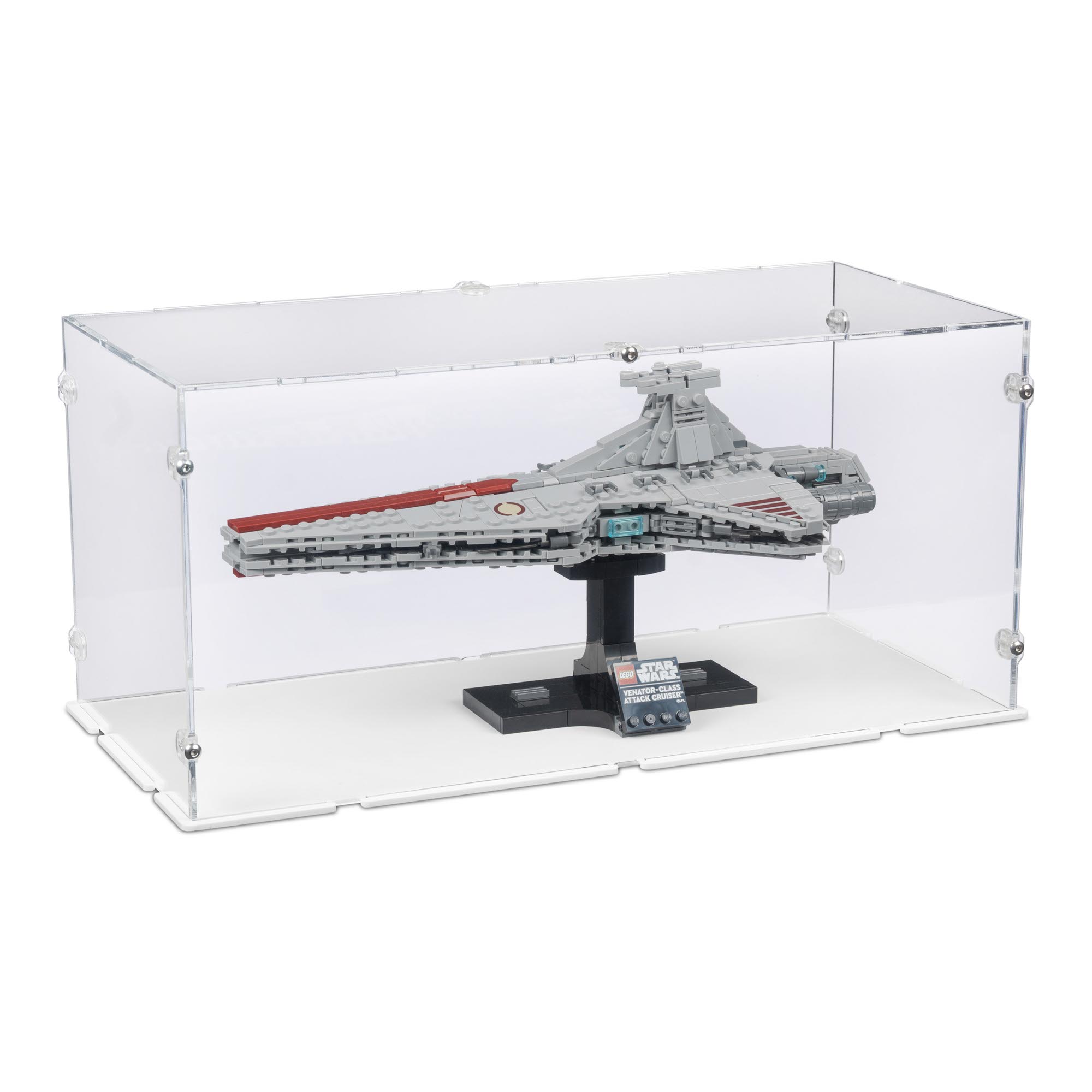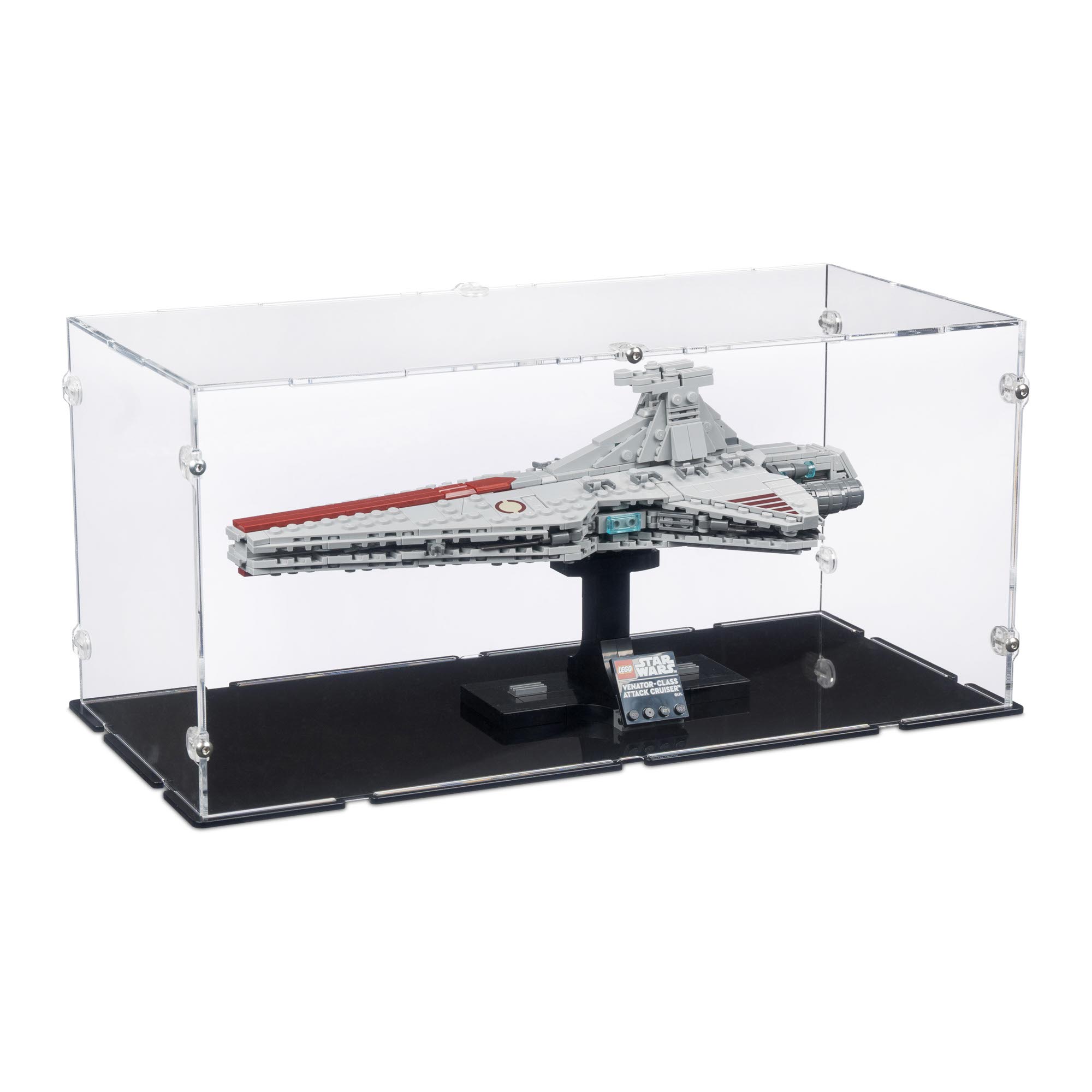 Diese Acryl Vitrine für den LEGO® Star Wars Angriffskreuzer der Venator-Klasse (Mini) – Set 75441 wurde speziell entwickelt, um das Modell sicher aufzubewahren und gleichzeitig optimal zu präsentieren.