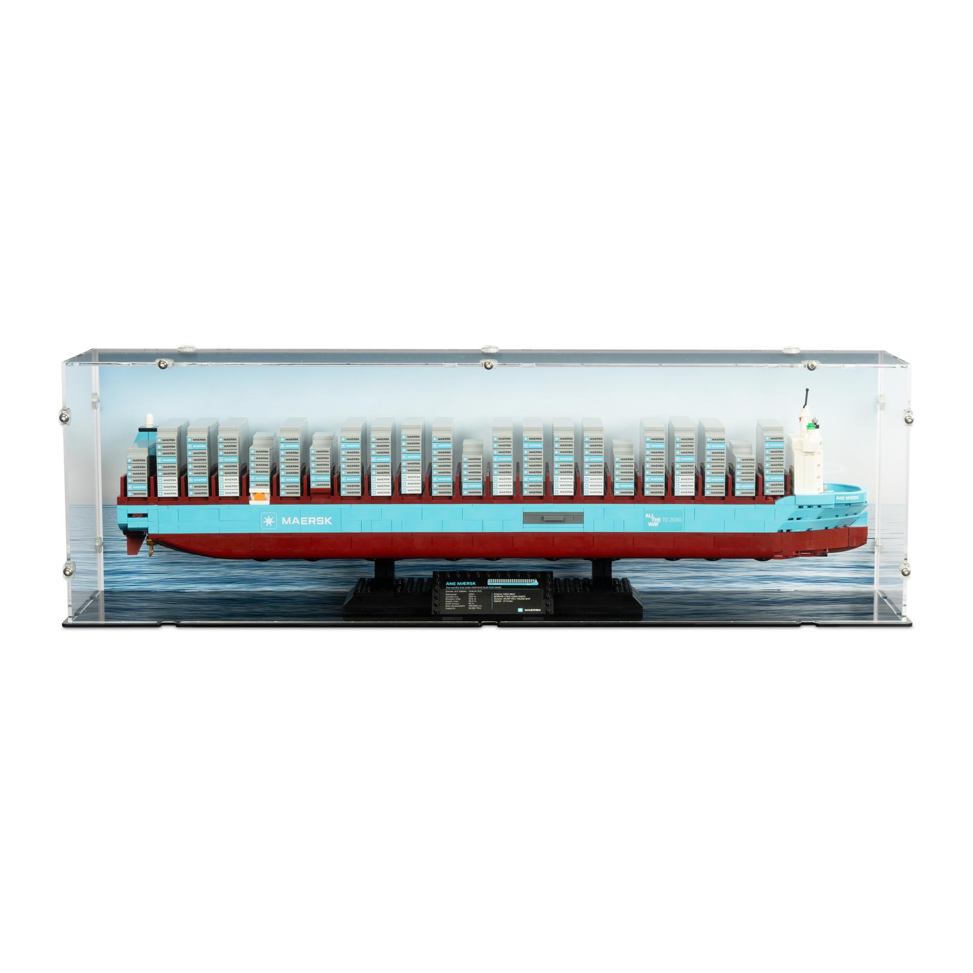 Diese hochwertige Acryl Vitrine wurde speziell für das LEGO® Set 40955 Maersk-Containerschiff mit Zweistoffantrieb entwickelt und bietet eine ideale Kombination aus Schutz und Präsentation.